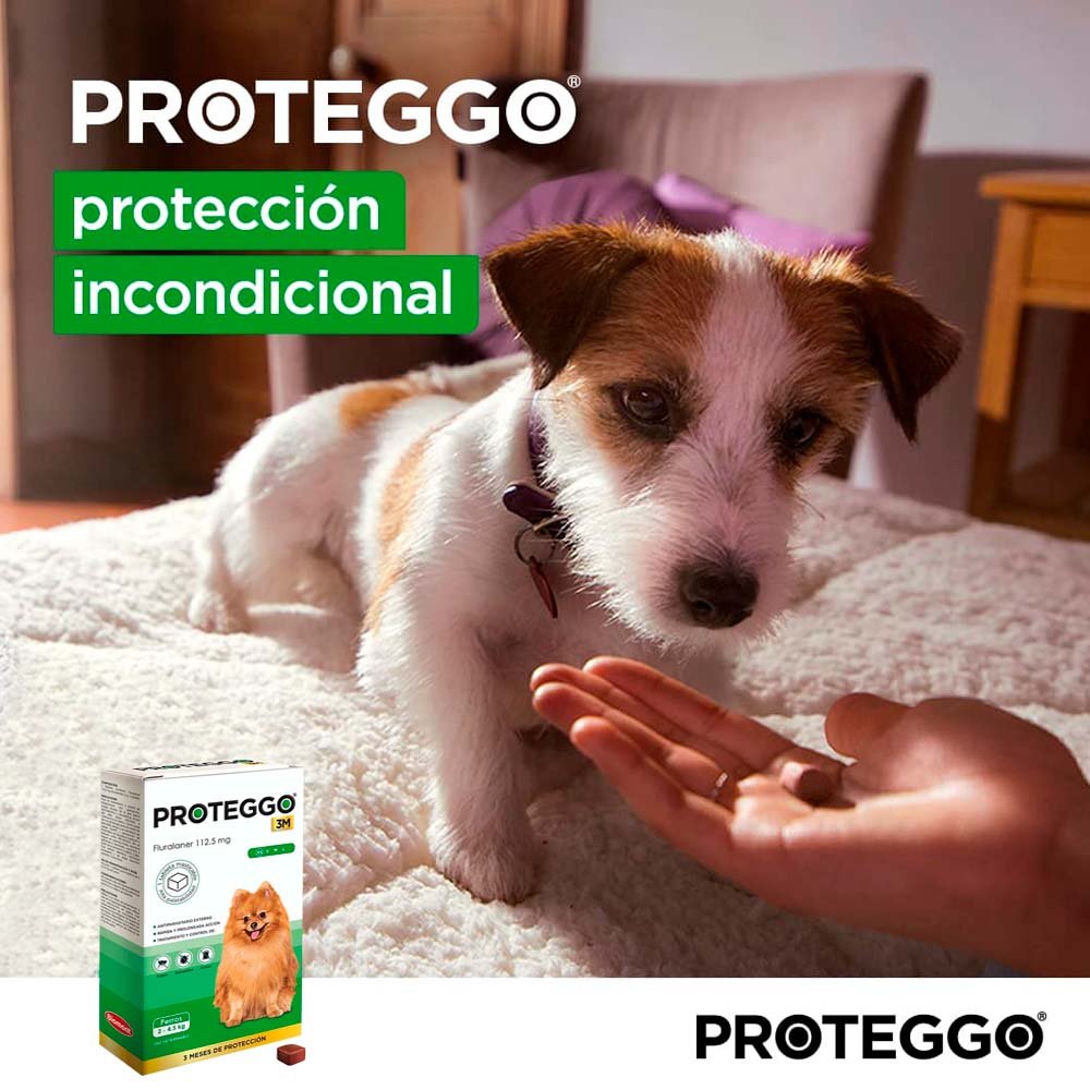Proteggo está indicado para el tratamiento y control de las infestaciones producidas por pulgas, garrapatas y ácaros en perros, proporcionando una actividad sistémica inmediata y de larga protección por 3 meses.