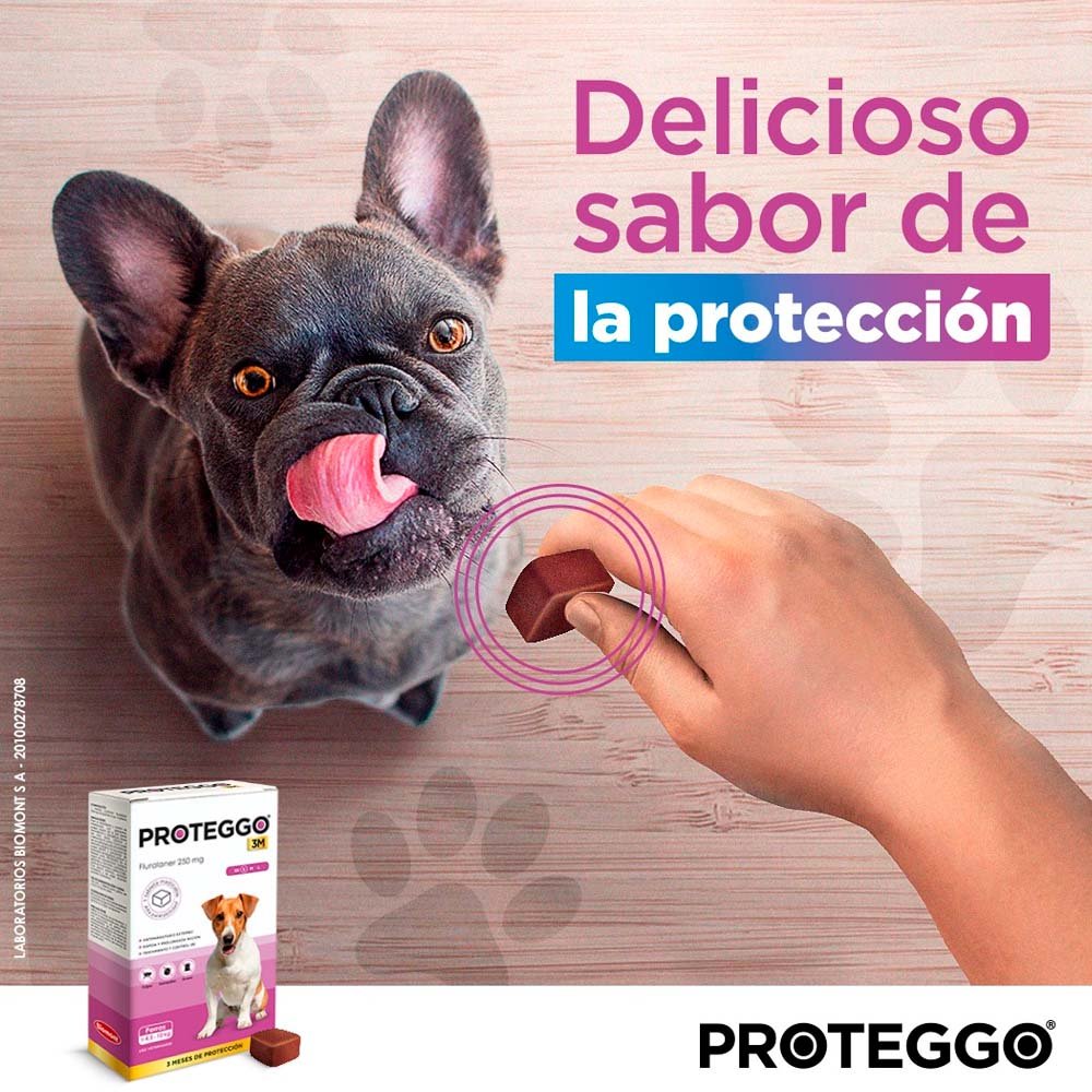 Proteggo está indicado para el tratamiento y control de las infestaciones producidas por pulgas, garrapatas y ácaros en perros, proporcionando una actividad sistémica inmediata y de larga protección por 3 meses.
