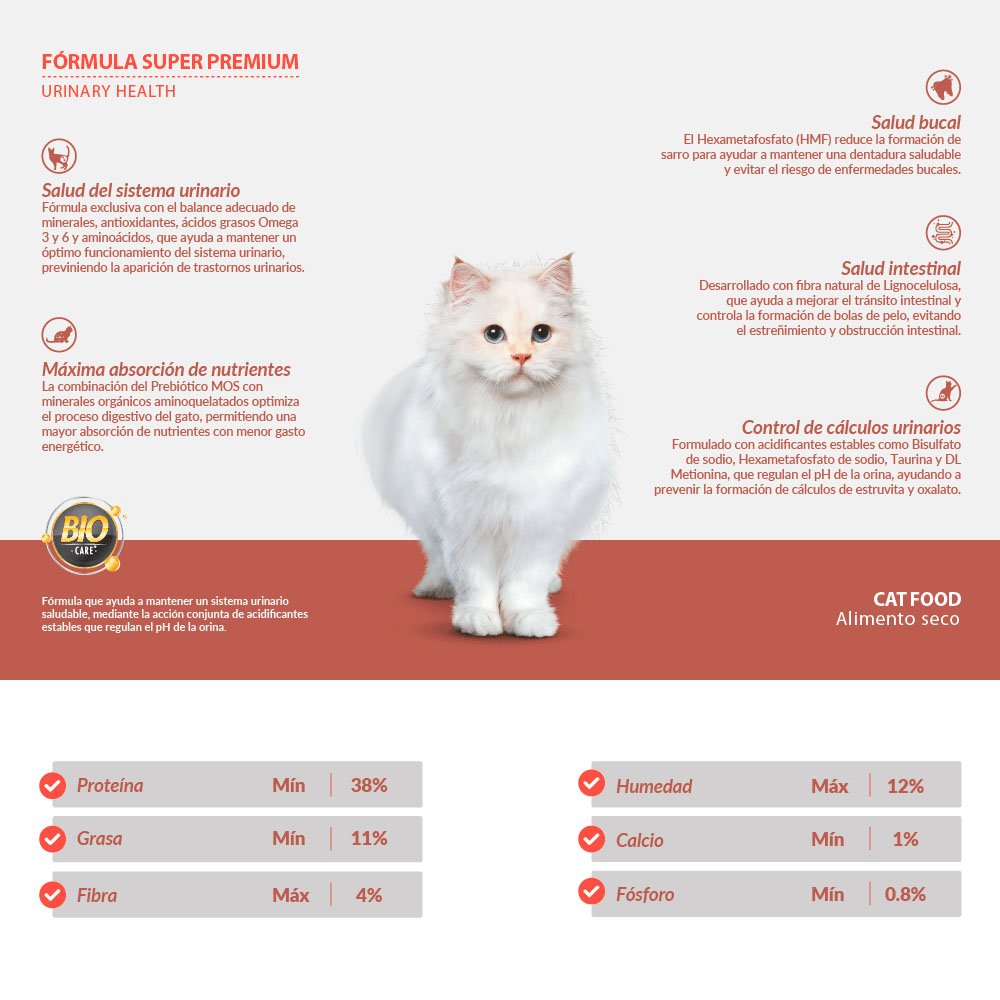 Esta presentaci贸n para gatos adultos cuenta con la formula avanzada 芦BioCare禄 que ayuda a regular el pH de la orina para lograr un nivel 贸ptimo y reducir los riesgos de formaci贸n de c谩lculos de estruvita y oxalato de calcio